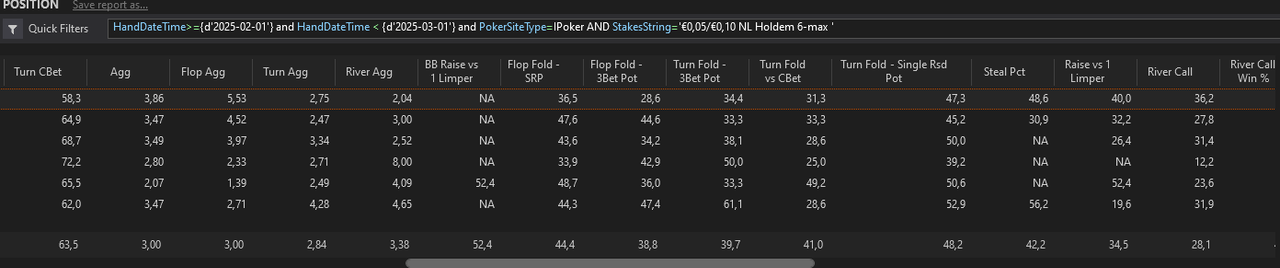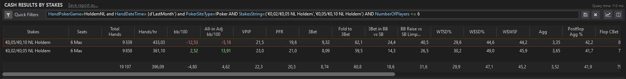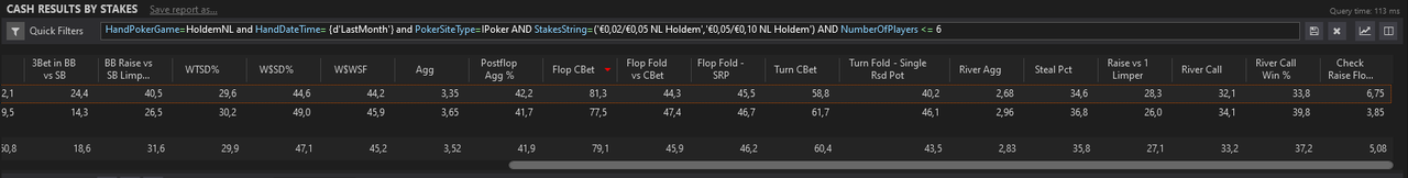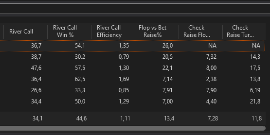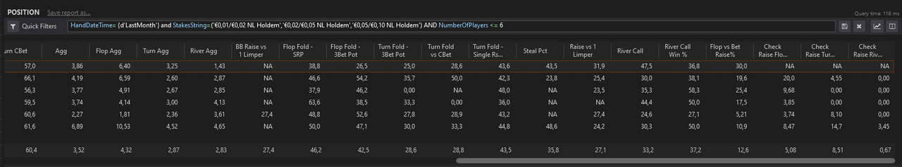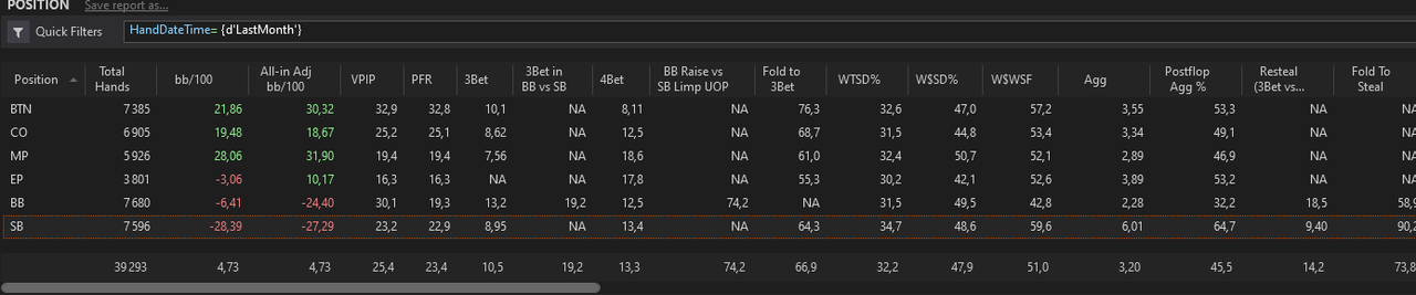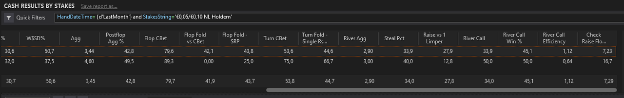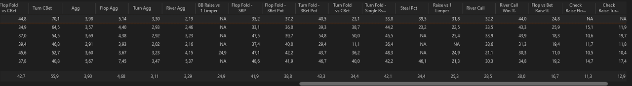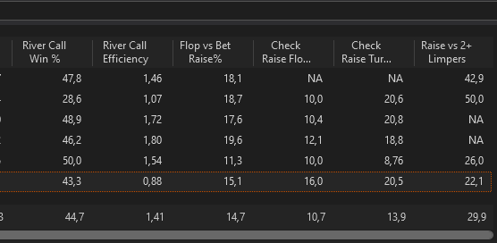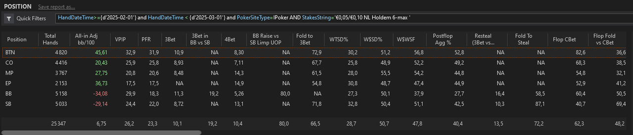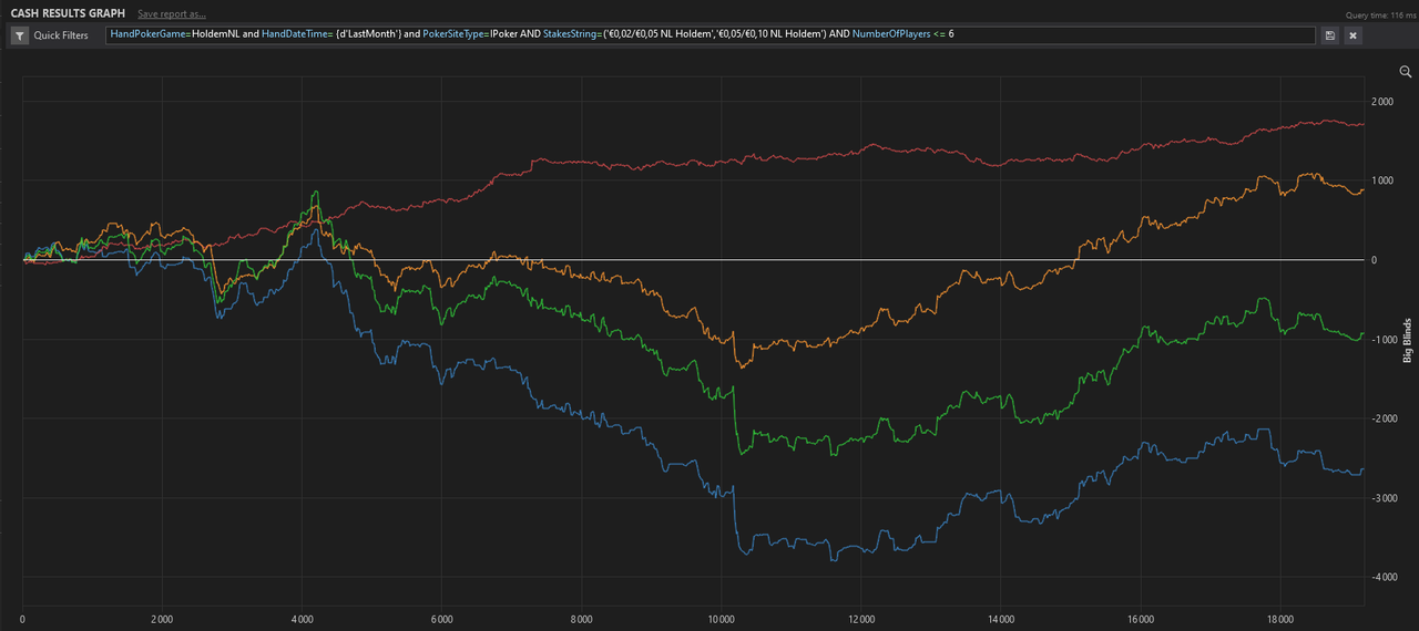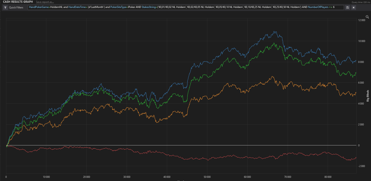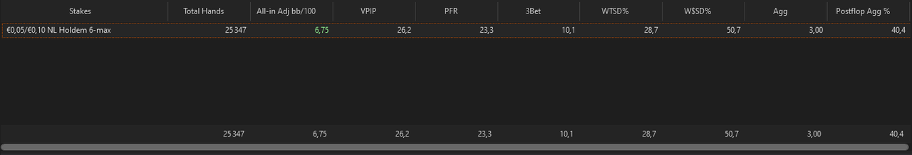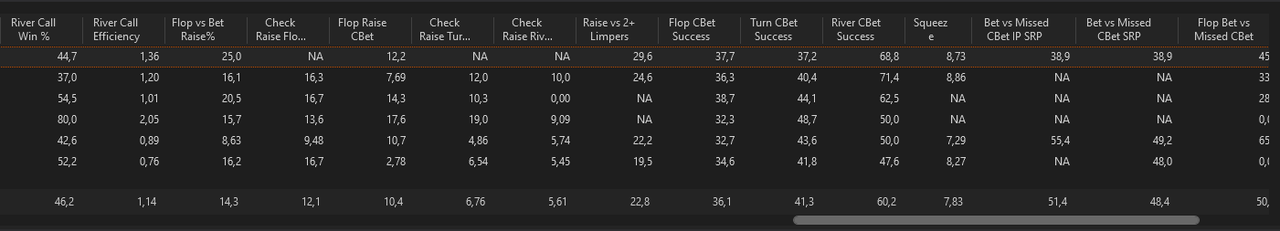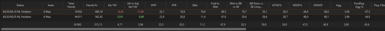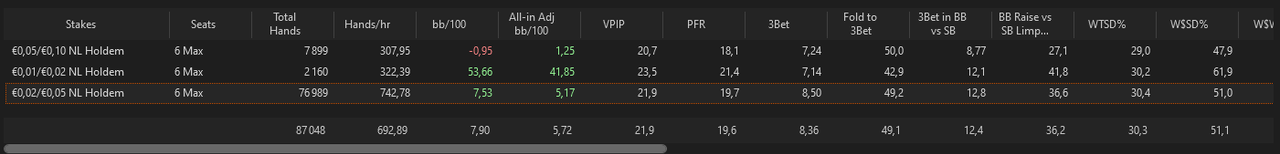 J’ai fait un nouveau leak finder après ces centaines de milliers de mains depuis le début de l’année, je me baserai sur ça pour mes axes d’amélioration pour les mois à venir.L’objectif est de pouvoir monter à 8EVbb/100 ce mois-ci, sur au moins 50 000 mains. Les 1000€ de BK seront atteints s’il n’y a pas d’accrocs d’ici 2/2,5 mois, signifiant très certainement une installation en NL10 car je mixe déjà la 5 et la 10 actuellement.