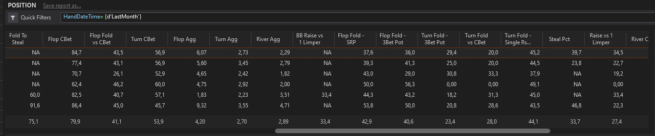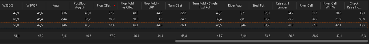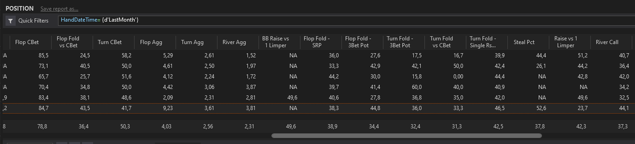 Un mois de juin encore axé sur la progression. Reprise active dans un groupe de travail pour se tirer vers le haut. Beaucoup de progression déjà. Quelques swings et beaucoup de leaks trouvés, notamment des leaks mentaux insoupçonnés qui affectent grandement mon jeu. Un cadre de jeu a été mis en place, une routine également, complémentaire à mes horaires de travail IRL ; 6 slots pour mes tables maximum en NL10 dans un cadre d’apprentissage. Un énorme spew de -14 caves sur PS mais qui ne s’affiche pas sur le graph. Je finis gagnant sur le mois grâce au rakeback. Je sais à peu près ce qui m’attend en NL25 alors je travaille déjà à surpasser la 25, je vais travailler tous mes spots un par un maintenant que j’ai acquis les bases du jeu et que je suis encadré, pour avancer pas à pas et sereinement. Il n’y a rien qui presse de mon côté. En ce premier jour de juillet, j’ai encore down -10 caves, swing variance, mais aucun tilt, un travail énorme ainsi qu’une introspection me permettent d’avoir une confiance stable dans mon jeu et garder un état de A-game le plus longtemps possible aux tables. Je sais que je suis gagnant à la limite, donc je n’ai pas à m’en faire, j’ai confiance en mon jeu. Evidemment il y a aussi les swings liés à l’apprentissage, test de nouvelles lines/actions etc. Très fier de moi pour la réalisation du volume fixé. J’aimerais continuer ainsi pour le mois de juillet. Encore une fois, je ne veux pas me fixer d’objectif de winrate, ça n’a aucun sens dans une optique de progression où mon jeu varie grandement. J’ai confiance en moi-même et je sais que d’ici la fin du mois, j’aurais été rigoureux dans mon apprentissage et que j’aurais solidifié une grande partie de mes bases. Pour le mois d’août, si ma progression le permet, je souhaite commencer à exploiter mes propres datas pour exploiter le field et développer mes propres stratégies. Avant ça, il faudra quand même que je m’informe sur les notions de bluff/value perçus, quel rapport garder dans mes lines etc. Quelque chose qui m’a grandement aidé ce mois-ci, c’est opter pour le double pastillage des vilains, car chaque catégorie trouve sa sous-catégorie, s’en suit la procédure : pastillage sur le soft et pastillage sur l’HUD différent selon la sous-catégorie.