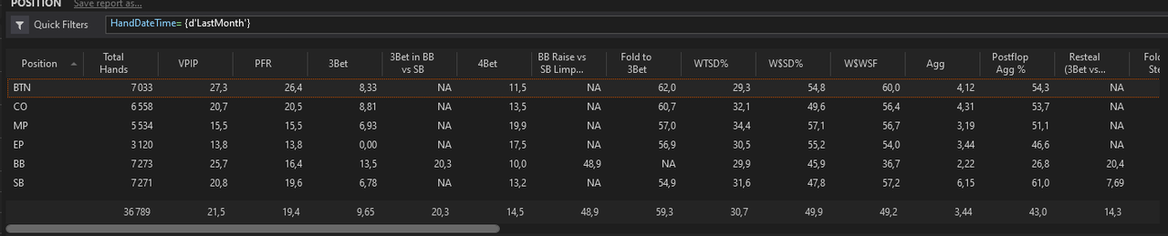 Pour le mois à venir, on travaille donc le pré-flop, on va continuer les flopzilla à fond fond fond, on apprend la mdf et enfin, on apprend à compter les combos in-game. En parallèle, on va aller voir le jeu en BB où j’ai un WR catastrophique -36bb/100, et on va travailler ce spot, on va commencer le jeu BBvsSB puis BBvsBU.