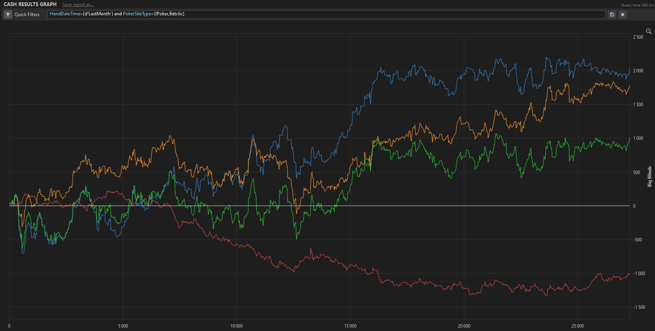 Ce que je pensais lors de la fin du mois dernier s’est confirmé, j’ai eu un declic qui m’a fait grandement step up. J’ai explosé ma BK, là où j’étais usuellement habitué à une BK très petite, j’ai goûté à 580€, une explosion en 2 semaines et demi. Ralentissement sur la fin du mois, beaucoup de choses à faire IRL, mais volume de mains respecté. Je joue pour le plaisir à côté sur d’autres rooms, ça me permet de ne pas jouer que pour grind mais aussi pour me détendre (et se détendre semble plutôt lucratif 😆 ).