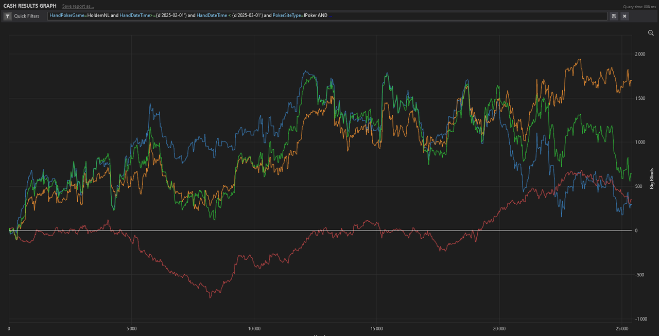 25 393 mains ce qui est largement au dessus de mes prévisions. Il y a eu beaucoup d’ajustements ce mois-ci et beaucoup d’ajustements à venir encore, histoire de mettre en place les engrenages et faire partir la machine. En terme de résultat on peut commencer à voir une tendance, je ne me fais aucun soucis de ce côté là, je pense clairement battre la NL10, à voir comment ça se passe en mars. Je ne veux pas d’objectif de mains par mois, les numérations dans le précédent message étaient seulement pour apporter une visualisation et ne pas partir à l’aveugle. Après ce premier jet, on peut rediriger la barque et ajouter en précision.