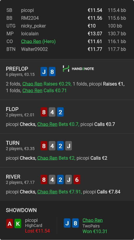 T’as pas grand intérêt à cbet, pareil pour le barrel sur une turn qui connecte trop le board pour que villain overfold de façon indécente, pareil river où je m’attends pas à ce que le pool de NL2, qui est par nature « indiscipliné », fold beaucoup DP.